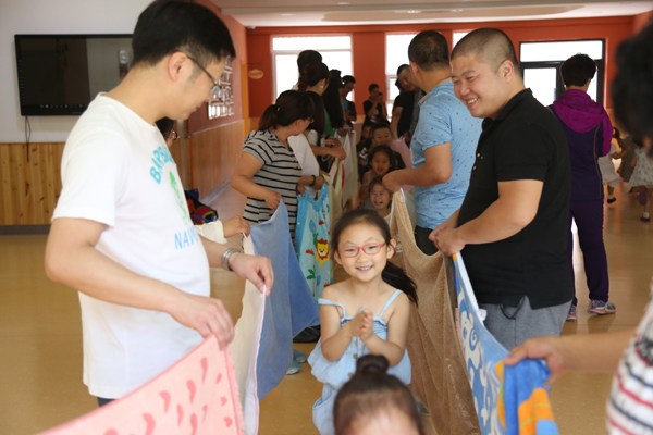午睡后,爸爸们陆续来到孩子们的班级,孩子们像快乐的小鸟般欢呼雀跃,小班组的老师组织小朋友和爸爸们利用毯子进行了一场“一物多玩”的游戏,所有大朋友和小朋友们一起发挥想象,利用手中的毯子带着幼儿拔河、荡秋千,许多家长将毯子拉开,组合起来变成“波浪”,孩子们时而像小鱼,在水中游来游去,时而像一帆船在大海中航行,毯子在大人的手中变化多样,孩子们尽情享受毯子不同玩法带来的乐趣;中、大班组的老师们精心筹备,开展了《站报纸》、《蒙眼闯关》、《传家宝》、《掷沙袋》等亲子游戏活动,在游戏中孩子们感受到父亲的力量和智慧,助威声、欢笑声充满整个活动室。每个家庭还展示了自创的亲子游戏,家长和孩子们踊跃参加游戏项目,不但孩子们有很高的积极性,家长也成了这次活动的主角。
