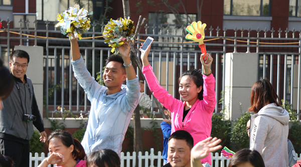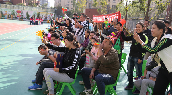 场下的啦啦队热情鼓舞,家长手中的照相机、摄像机频频闪动,唯恐漏下每一个精彩的瞬间。比赛环节一个接着一个,加油声、欢呼声、呐喊声沸腾了整个运动场。在欢声笑语中亲子比赛项目顺利结束,宝贝们得到了自己心仪的礼物。