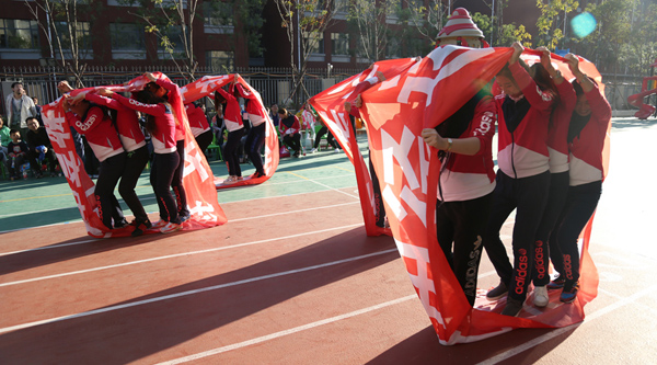 接下来的内容更是精彩纷呈,各班老师进行了“条幅坦克兵”的团队游戏。赛场上,老师们默契配合,场下的小朋友和家长们为自己班的老师加油助威!