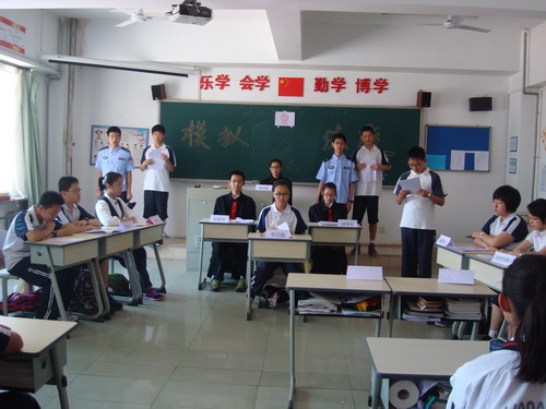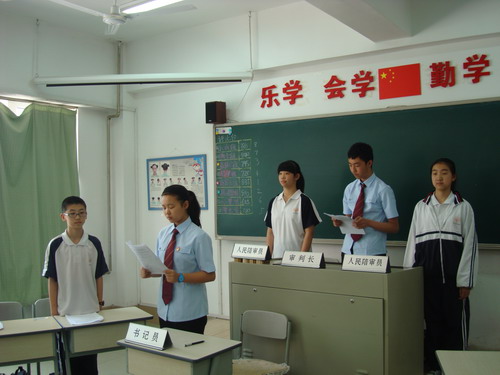 模拟现场,庄严肃穆。同学们身穿法官服,手持法槌,一招一式,颇具风采。为了达到这样的效果,任苏媛和刘辉两位教师在活动之前做了大量工作。首先在课堂上讲解法庭审理案件的几个阶段,并观看相关录像,帮助学生了解庭审的全过程。其次,让学生利用课余时间上网查找“模拟法庭”的剧本,并进行改编。最后,各班指派专人组织此次活动,由他们根据班级学生情况分配角色,利用课余时间进行练习。在整个活动过程中,学生们的积极性非常高,有的学生在父母的帮助下借来法槌和服装,有的学生带来录像机把活动录下来留作纪念。