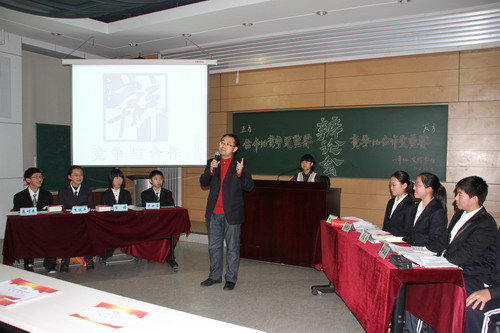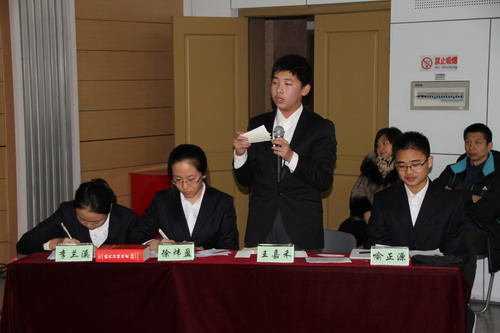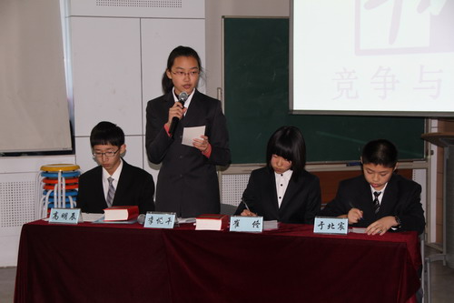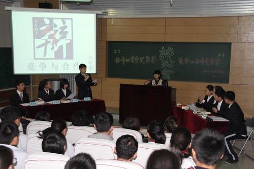经过前一轮以“上网利与弊”为主题的辩论赛,我们从各班级中选出最佳辩手重新组成了新一轮以“合作和竞争”为主题的辩论赛的对战双方。正方由于北宸(8.5)、崔佟(8.3)李悦平(8.4)和高铭辰(8.2)组成,他们的观点是“合作比竞争更重要”。反方辩手为李兰溪(8.4)、徐炜盈(8.1)、王嘉禾(8.6)和喻正源(8.2),他们的观点是“竞争比合作更重要”。双方唇枪舌战,正方开篇立论气势恢宏,反方的自由辩论咄咄逼人,经过激烈的角逐,最后反方获胜。