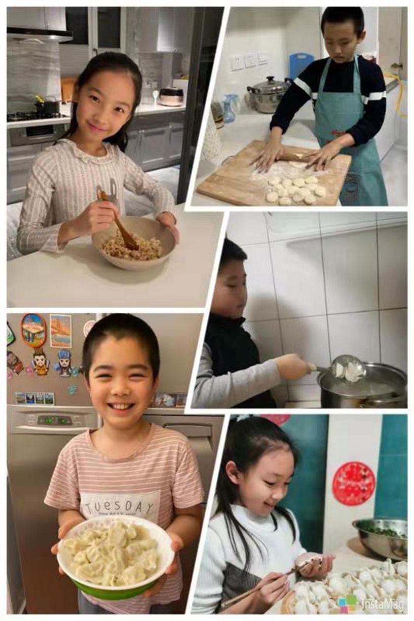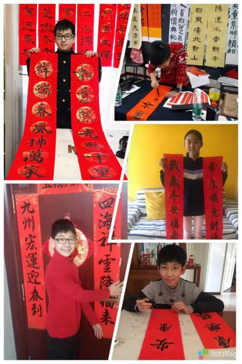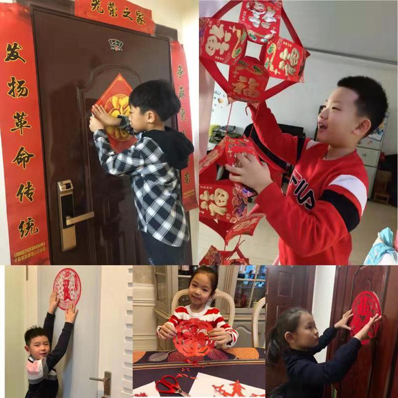 “辞旧金猪歌日丽,迎新瑞鼠报平安”伴随着辞旧迎新的爆竹声,应和着家人团聚的欢笑声,年三十,四年级的孩子们与家人一同守岁、包饺子,他们把对未来的期许和对家人美好的祝愿都包进这元宝似的饺子中,他们沉浸在浓浓的年味里,传承了年文化,培养了民族情怀;五年级的孩子们将学校学到的知识运用到传统手艺之中。他们亲手DIY“鼠年”创意灯笼,将灯谜或悬挂或粘贴在灯笼上,语文与艺术有机结合,不仅营造了欢乐祥和的节日氛围,还让年文化焕发出勃勃生机;“千门万户曈曈日,总把新桃换旧符”六年级的孩子们将平日的书法学习,延伸到年俗文化活动之中,他们书春联,贴福字,用传统文化的方式迎春纳福喜庆团圆。